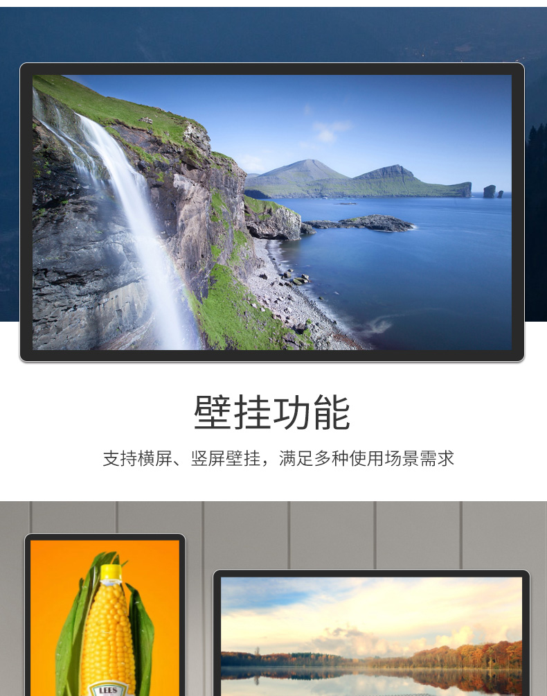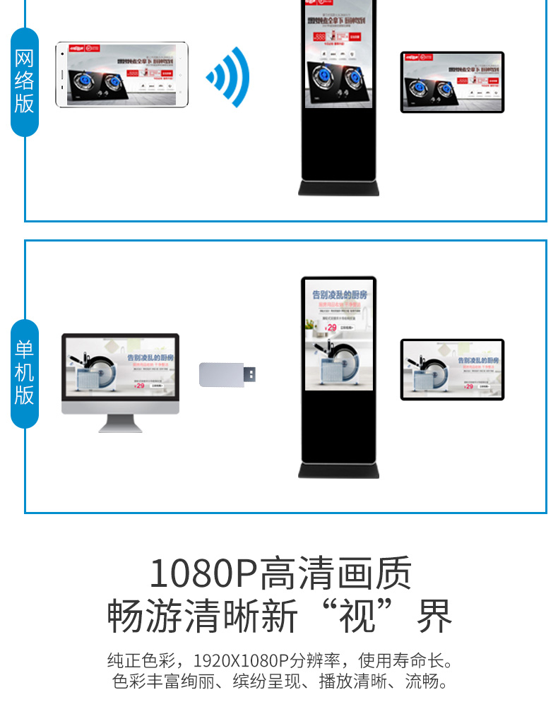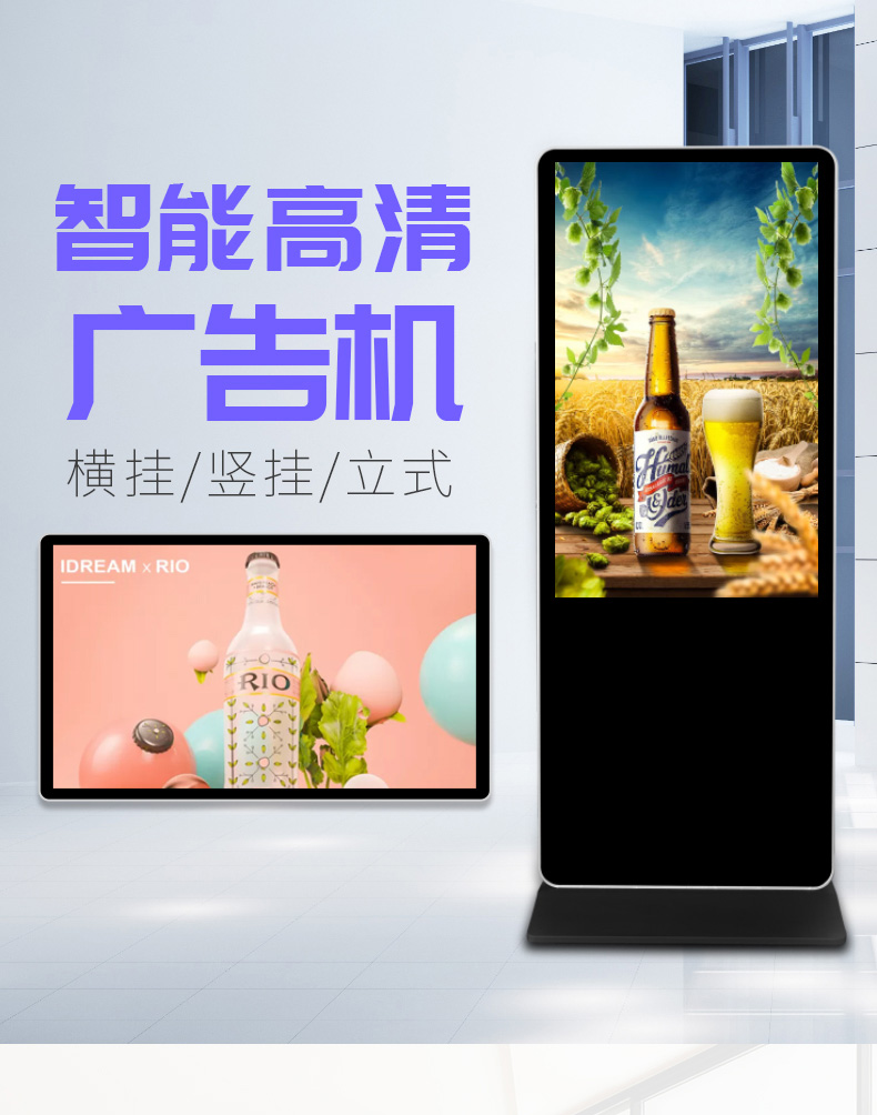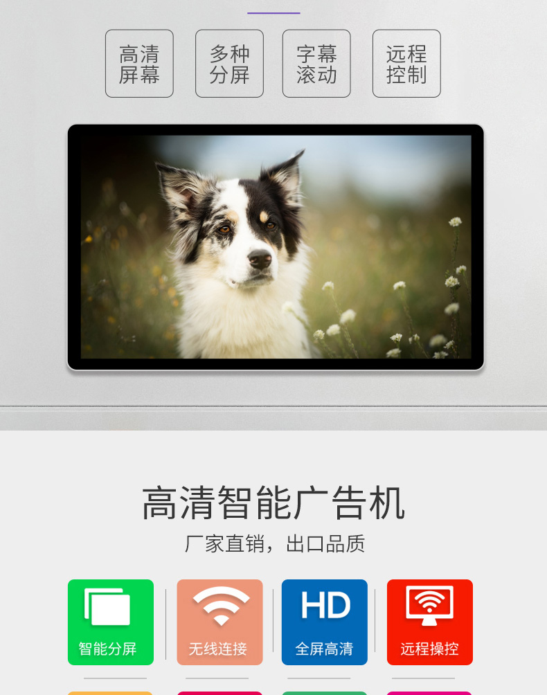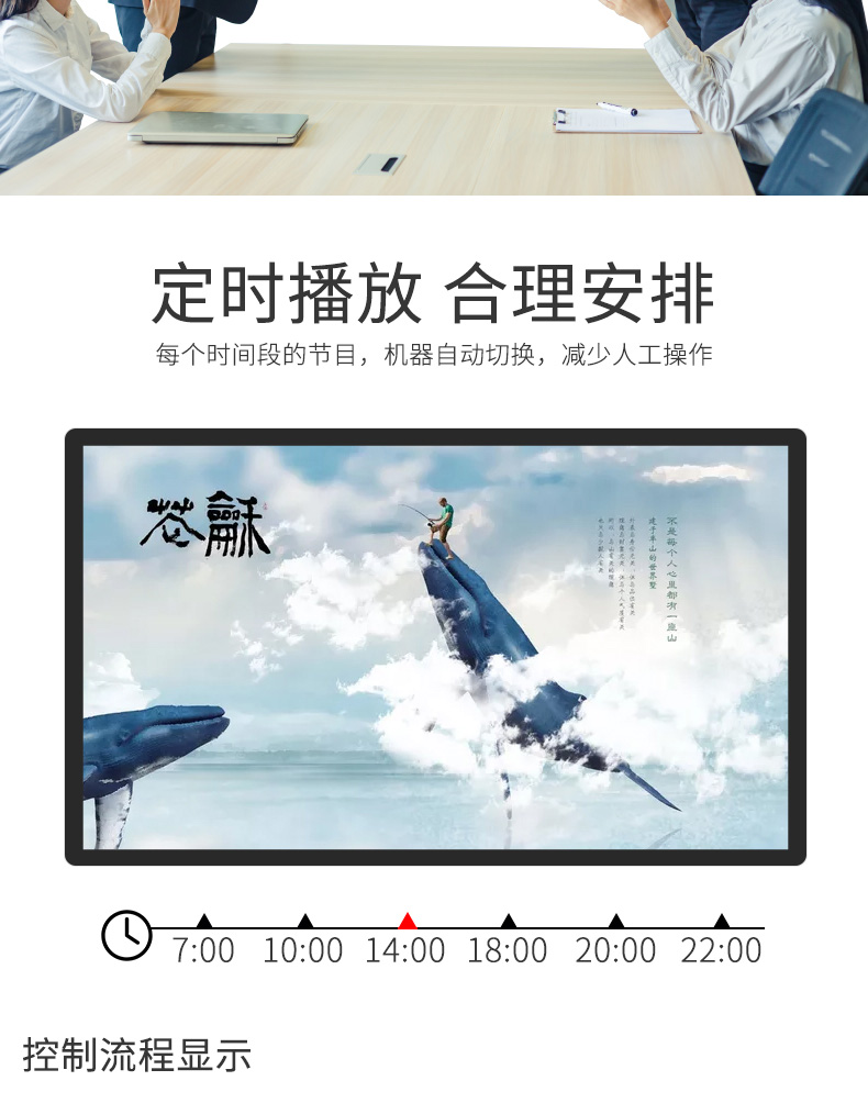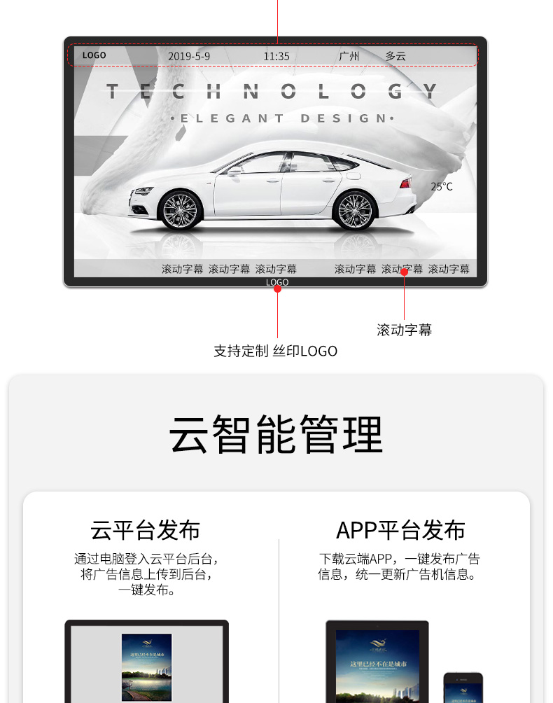 智能高清 4K 大屏,纤薄机身;远程发布,流水滚动字幕,一键智能分屏;无线投屏,横竖屏设置,支持 7 *24H 工作。