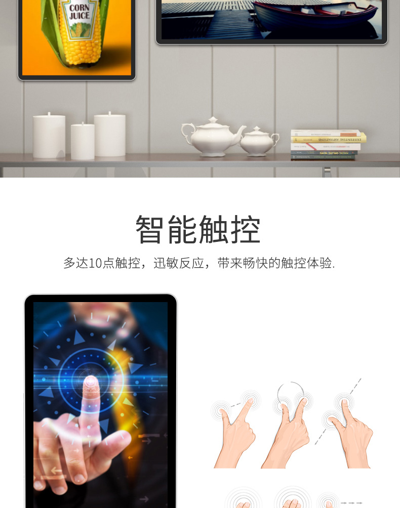 【系统配置】安卓/Windows系统,1080P 全高清,16.7M 色彩,U 盘自动识别,图片 / 视频 / 音乐轮播,智能解码,可兼容主流文件