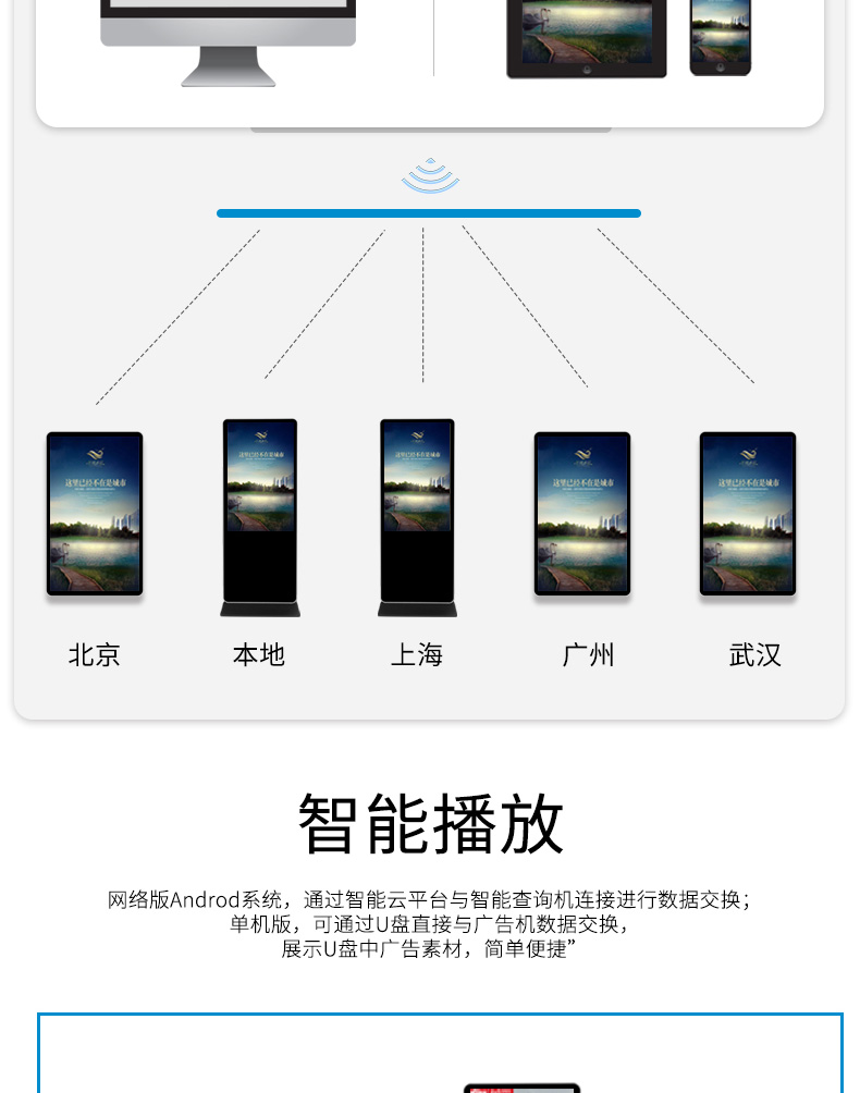 【系统配置】安卓/Windows系统,1080P 全高清,16.7M 色彩,U 盘自动识别,图片 / 视频 / 音乐轮播,智能解码,可兼容主流文件