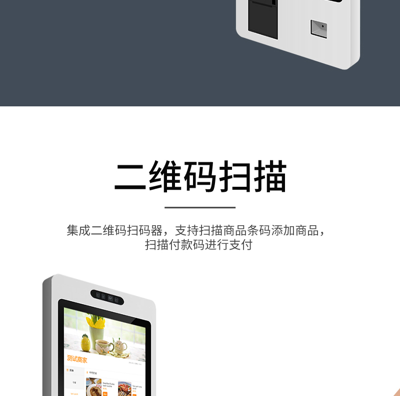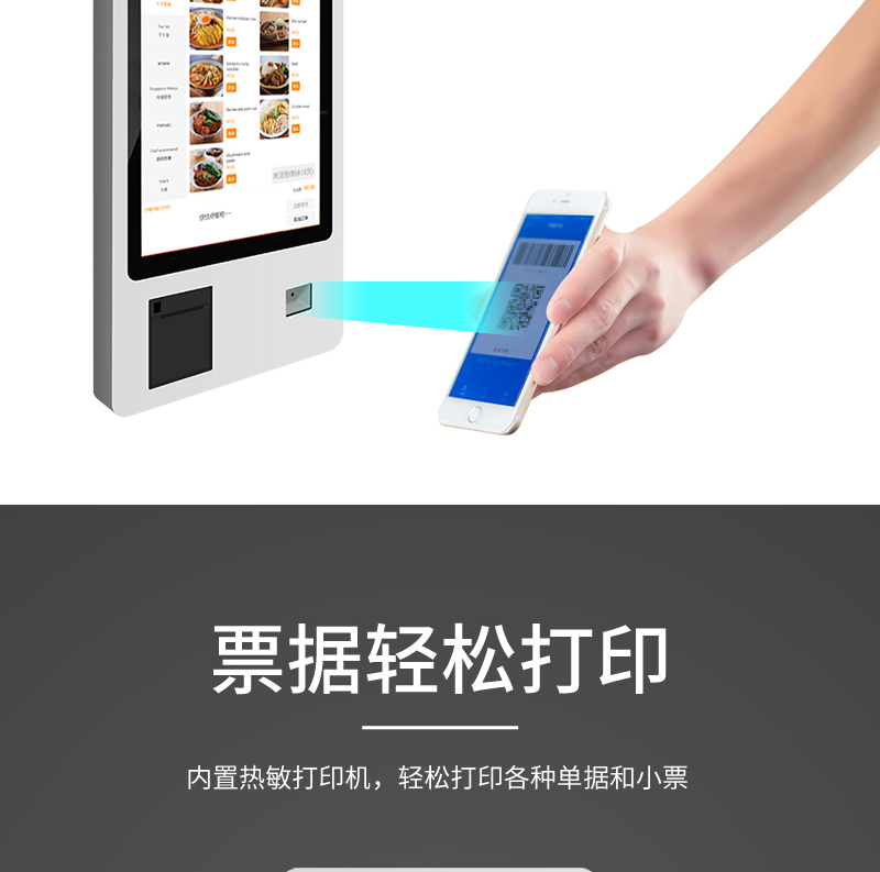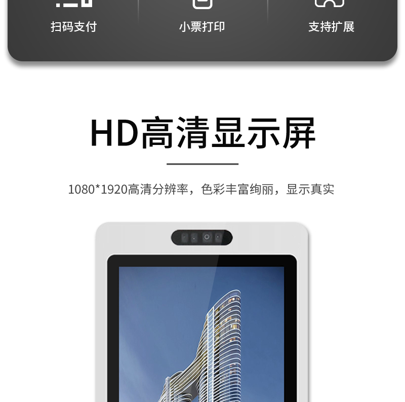 【产品简介】高清显示屏,多点触控,一触即发,抗干扰,支持二维码扫描,轻松打印小票单据
