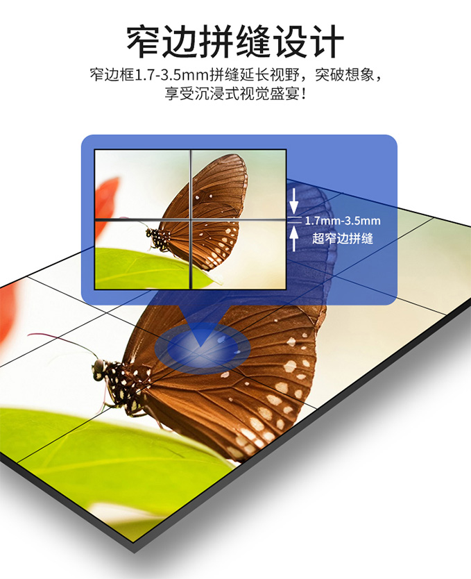 纤薄窄边拼接设计,超大屏幕百变播放,可任意选择(行(m)×列(n)),也可以采用艺术性的异形拼接单元,屏的大小以及拼缝都有多种选择,可以满足不同的场合需求。